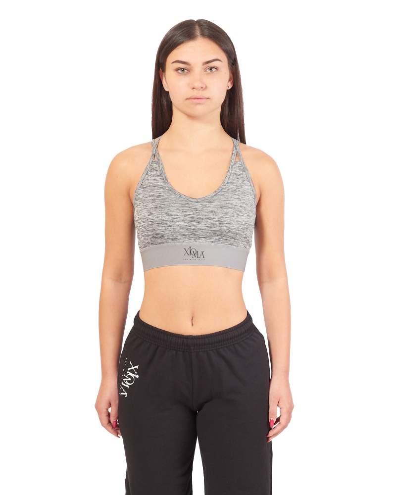 Top grigio sportivo con dettaglio a strappo sulla schiena. La parte anteriore offre un maggior sostegno grazie al doppio strato. Senza coppe o tasca per l'inserimento. Il tessuto del top è ad asciugatura rapida. Il logo XIOMA' nero sulla fascia elastica.