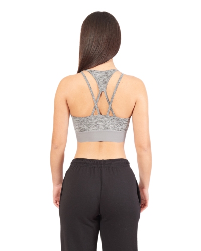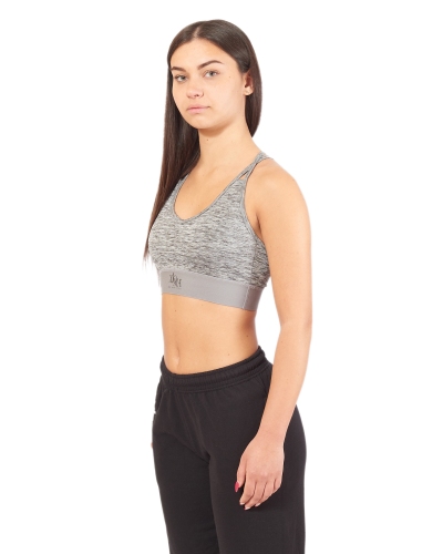 Top grigio sportivo con incrocio sulla schiena e logo nero sull'elastico.